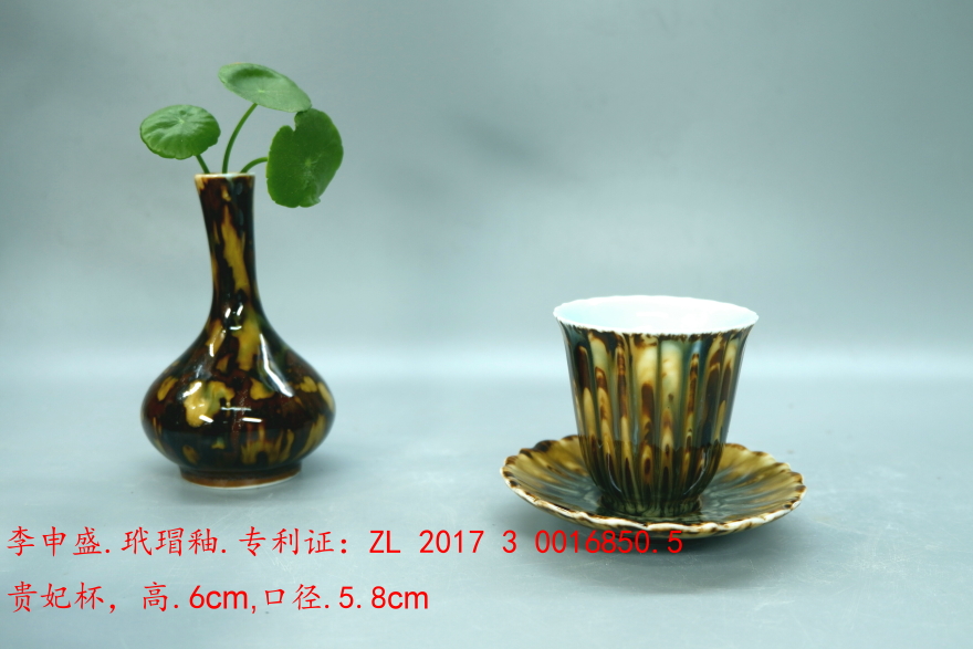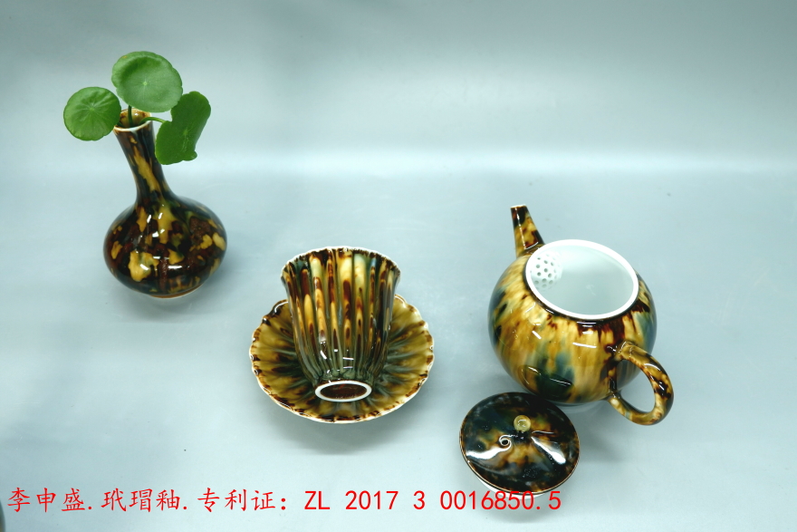 作为茶器,必须是安全卫生、色泽稳定,李申盛一开始就决定用高温瓷来试制玳瑁。很多色块在中温陶器上比较容易实现,甚至到了高温陶器上也相对容易得到,但是一到高温瓷器上就很难成功。高温颜色釉的表面色彩是千古恒定不变的。申盛的玳瑁釉茶器在景德镇市检验检疫科学技术研究院检验,报告证明无金属析出。
