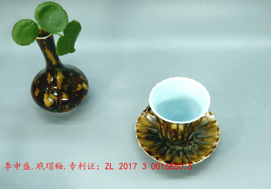 有一次,一位中国美术馆收藏鉴定评价委员走进“了了亭”,对李申盛的高温颜色釉茶具很感兴趣,我把一个精品玳瑁釉茶杯拿出来请他指点,他拿着茶杯很兴奋,急切地问:这是谁做的!得知是出自我儿子之手后,他很惊讶:他在那里,叫他赶快来,我要见他!