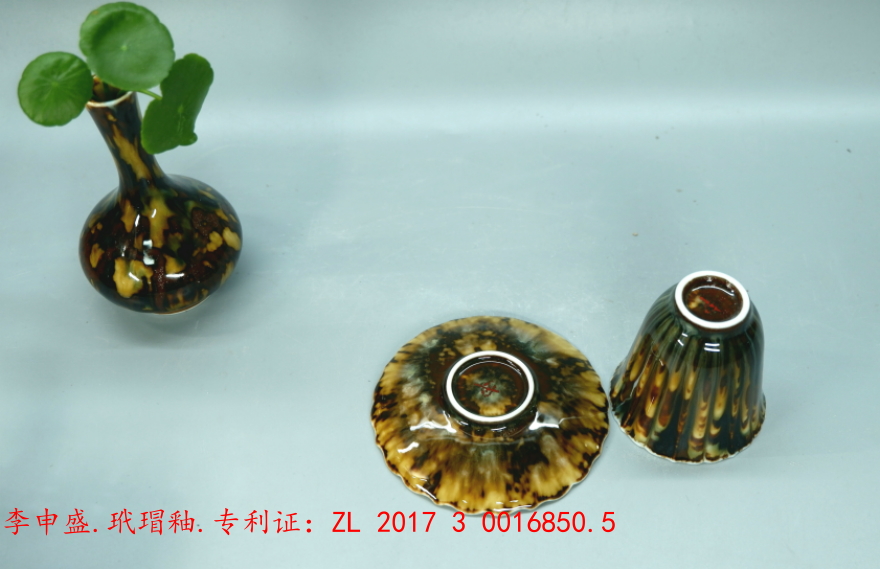 李申盛研究古代江西吉州窑、四川西坝窑等窑口的玳瑁碗盏的色泽纹理;基本上只有一种黄色的斑纹,一色黑褐的底釉,而且都是陶器,烧制温度不高,均属中温陶瓷(摄氏1100℃下烧制为低温,1100--1250℃为中温,1250℃以上为高温。)80年代,位于景德镇的“中国轻工业陶瓷研究所”曾成功研制玳瑁釉。但是没有形成生产。其中一个样品出现在2014年“中国轻工业陶瓷研究所60年拍卖专场会”