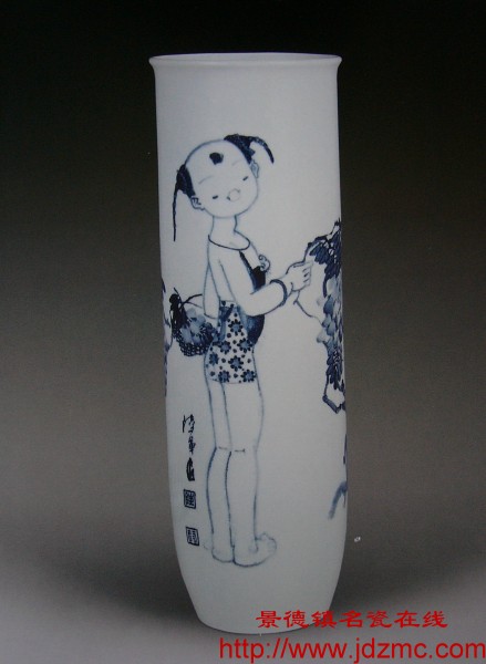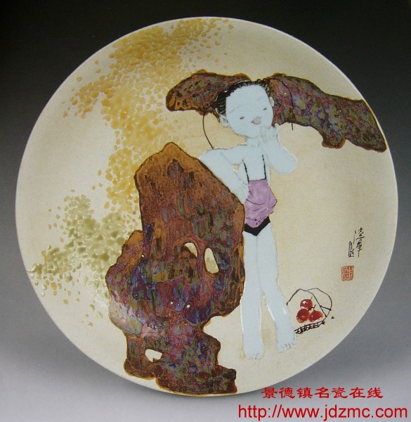 陆军为寻找立足于陶瓷美术界的艺术支点,以长补短,出人意料,他卧薪尝胆,面壁数年,创作出陶瓷板画《陆氏童》系列:下棋的·赏花的、扑蝶的,形态各异,情趣天然,稚气可爱,拙味十足,表现出古代儿童天真烂漫的童趣。那拙与巧结合的金童玉女,配以虚实相间的环境,引人步入一尘不染超凡脱俗的意境。