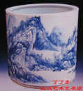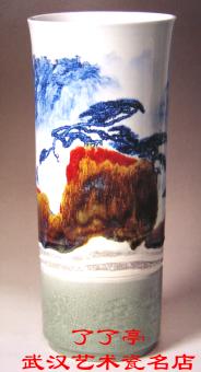 大口梢外撇,筒式长腹,圈足宽矮。胎体洁白细密,釉色莹润,白中微泛青。画面构图简约。作者利用高温颜色釉茌窑变中产生的意外效果表现近景山石,以浓翠的青色描绘岭上苍松,笔力遒劲。淡云飘缈茌奇松与远山之间,形成变幻莫测的云海。瓷瓶下部的色釉边饰及刻花文字,展示了景德镇瓷器工艺之美。