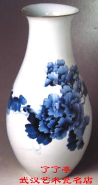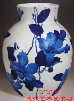 瓶口微向外撇,圆唇,粗颈,长圆腹,迮腹甩。瓷质细腻洁白釉面光滑茔润,釉色白中微泛青。画面依器形随势构图布局,不落俗套。作者摒弃平面绘画形式,运用青花分水忮法,绘枝描叶染花各尽其妙。青花色泽纯正、沉着、稳定。此作反映了作者深厚的艺术修养和创新的探索风格。