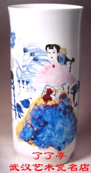 大口外撇,筒腹微下收,高足胫,造型简练挺钹。胎质洁白细腻,釉汁晶莹肥厚,釉面光亮,釉色泛鸭蛋青。装饰性构图,人物形象端庄秀美。艳丽的高温色釉所作的团扇及花釉所作的长裙,将仕女的形象衬托得更加高雅。这是一件艺术美与工艺美结合得较好的、具有形式美感的作品。