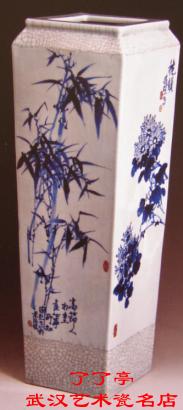 平口四方形,短斜肩,直腹至底,上大下小,造型庄重。肩部与底部饰哥窑百圾碎,尤显古朴。器身四面分别绘梅、兰、竹、菊四君子,用笔流畅,技艺娴熟,青花发色纯正,幽雅清新,画面充分体现了中国文人画风的雅致气的。