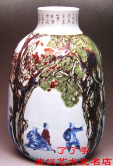 敛口,鼓腹,圈足。画面主体绘两名活泼可爱的孩童正在看梅和画梅。那大批如流霞般的梅,虽说是用青花一色来绘制,由于作者恰到好处地掌握了青花分水技法,把枝干和梅花描写得浓淡有致,妙趣横生,稚气可掬,看来亲切、可爱,又给人以无穷的遐思和无限的美感。
