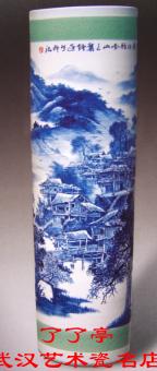 画家以精湛的技浅用青花料在箭筒上描绘春景:崇山峻岭之中,丛林茂密,苗家的竹屋吊楼错落干山·腰,整个画面表现得淋漓尽致,构成了一幅独具特色的山寨风貌。从作品上可以看出作者具有深厚的绘回功底和对大幅画面的驾驭能力,并且对青花工艺的研究也是非常情深。