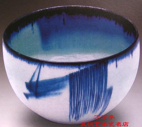敛口,深弧腹,圈足。造型敦厚,给人以浑然一休的感觉。全器施甫釉,钵口为紫金釉。内外壁上垂直的甫花排线,垂淌的紫金釉,大笔斜挥轻抹而成的色块及数笔细线,内外呼应,意趣顿生。作品给人以黑与白、疏与密对比的形式美感,富于现代装饰意味。