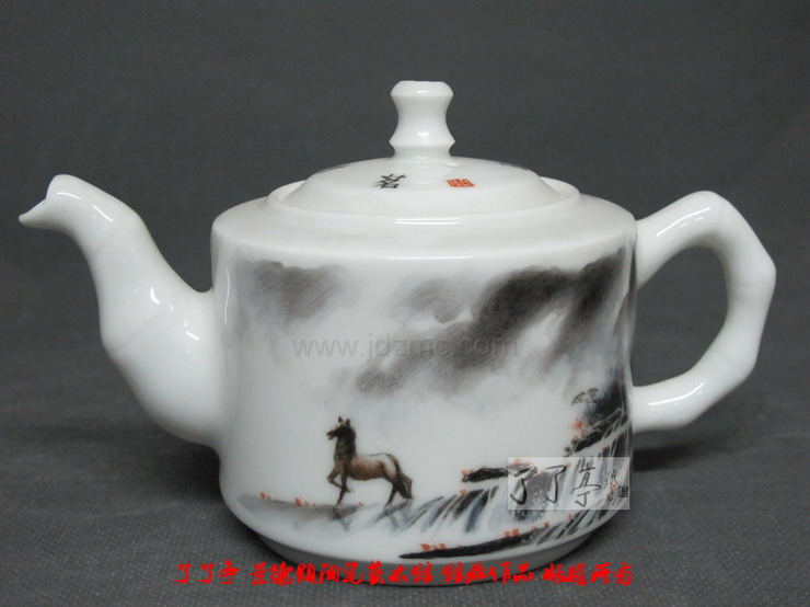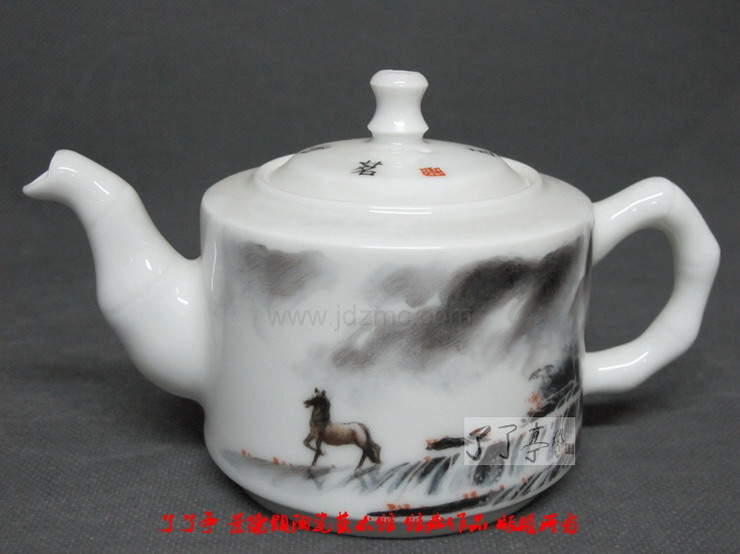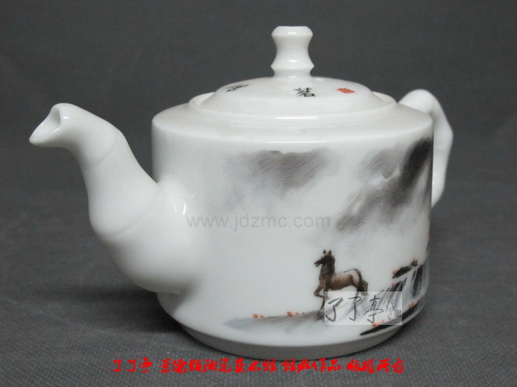 那天程曲流夫妇来我店里聊天,天南海北地谈着谈着,自然地就淡到了陶瓷,当时我手里正在把玩一把汪桂英老师的壶.那壶壶形小巧玲珑,加上汪老师那一笔好画.拿在手上真是一种享受,很惬意.突然间一个主意跳出来:"程老师.帮我画几把小茶壶好不好?" "好啊。"他很爽气地答应了。我了解经纪程老师作品很多年.我知道他过去从来没有画过壶。但我很为我这个建议兴奋,我深知陈曲流老师手上工夫,景德镇陶瓷职工大学的“美术系”是由他一手组建,当年为了生计,也为了展示自已的画才,他画过多部连环画,每一部都出版了.他至今还记得,第一部连环画出版社付了他 150元稿费,老师们要他请客,他用了七元钱大家高高兴兴吃了一顿。 |