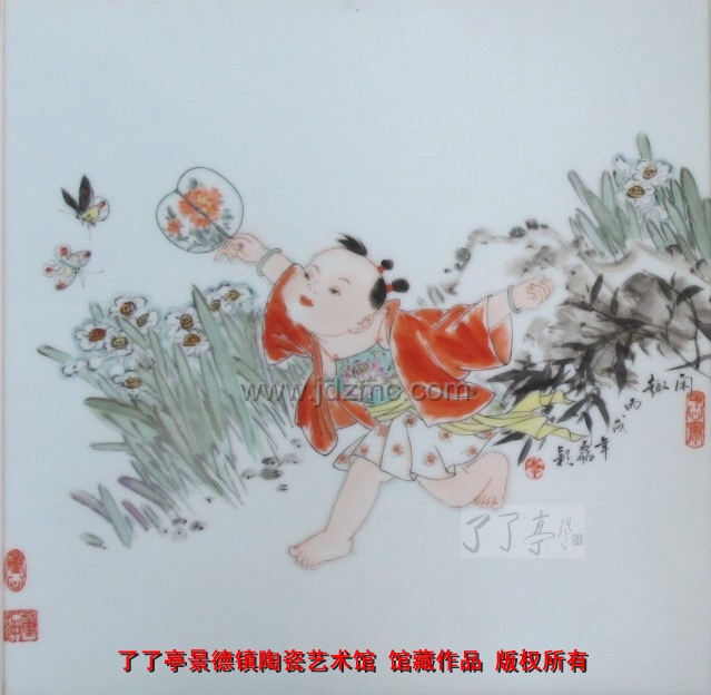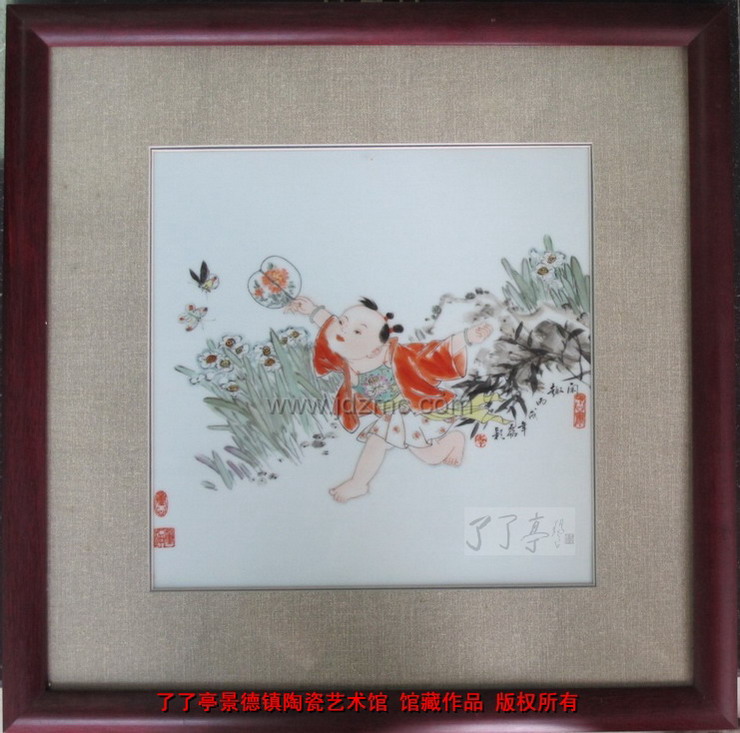 李磊颖的婴戏,是独立独行的自创名牌.她是陶院老教授施于人最得意的学生.讲起施教授,她感触很深.施教授看重李磊颖的才气.勤奋和敏悟.同时也是李老师的浙江同乡.施教授家里烧什么家乡莱,一定会把李老师请过去,像自己的孩子一样关心,爱护.有这么一个好导师授教与关怀.乃是李磊颖的福与缘.李磊颖是以受到注目的满科全优的成绩毕业的.在她彷徨前途之济,还是施教授,力邀李磊颖留校.李磊颖没有辜负这一切.她脚踏实地的努力着,奋斗着.李老师是个内向的,内秀的女子.对孩子充满着发自内心的爱,正是这种真诚的爱.和扎实的绘画功底.终于,从她手中走出了一群活泼.调皮,可爱的小精灵,为收藏家们送去了欢欣和谐的陶瓷文化的享受.受到收藏界的欢迎.艺木界的认同.今年嘉德筹备嘉德拍卖公司历史上第一次现当代瓷器拍卖,李磊颖作为中青年画家入选.为数不多的一个.当时嘉德负责这个项目的陈林林首次看到她的作品,很是喜欢,也很高兴.对她信心十足.