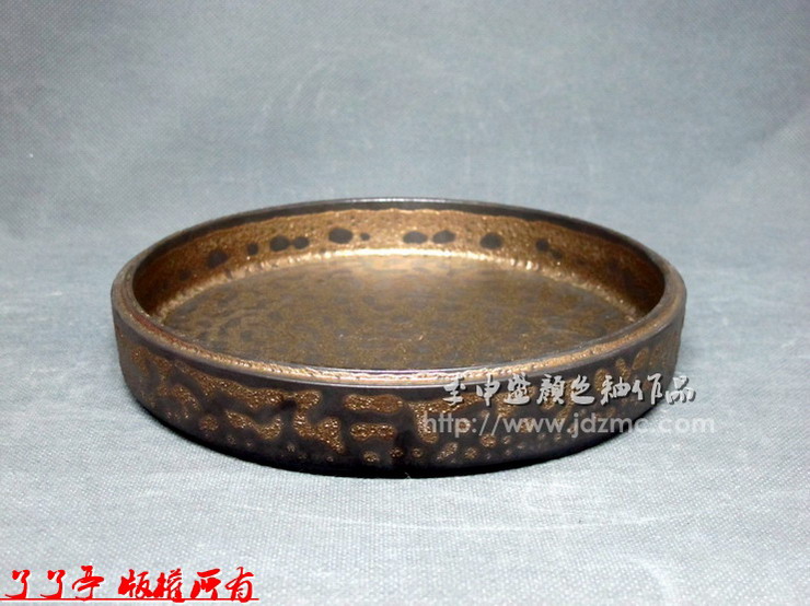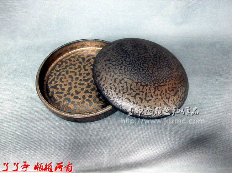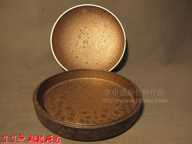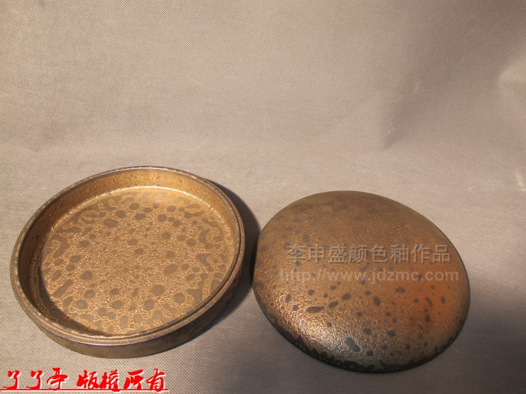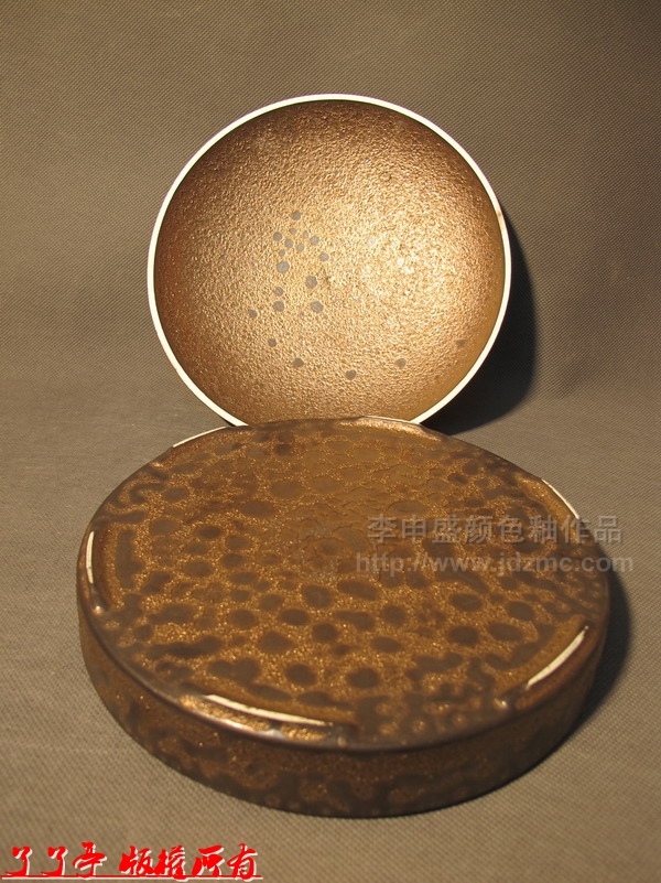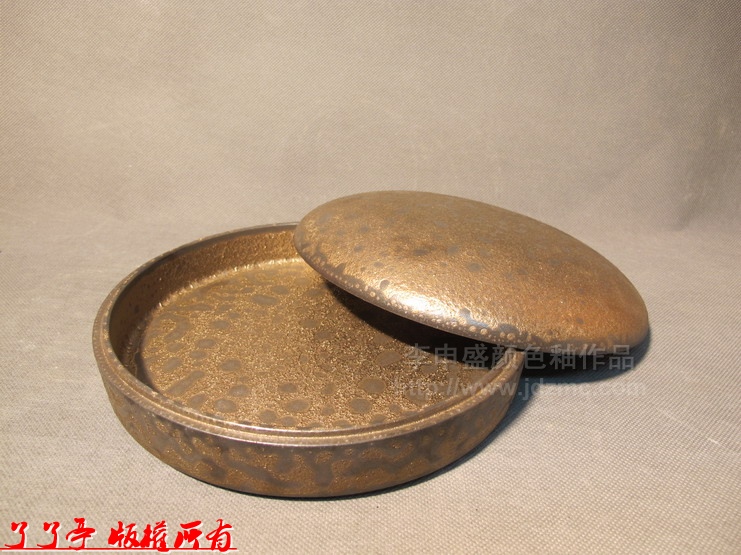 这是一件金铜釉茶饼盒,金铜釉的研究耗时一年半之久,釉体为高温单色釉,表面有微凸饰纹,其釉面为金属铜化合物,釉质厚,易流淌、不均匀,半途凝结,件件古香古色,独一无二,通体金色,高温凝结,恒古不变,这些有着向宋瓷靠拢的特征。观釉色,似金似铜,微凸纹饰窑窑不一,色彩均有不同。如有天赐,纹理凝结成字形,如神符一般。击之,闻声有金属之音,音色如磬,古韵悠长,有类似铜磬之美。如为雕塑,高贵凝重,釉中肌理变化神妙奇玄。了了亭·李申盛/文