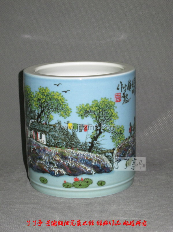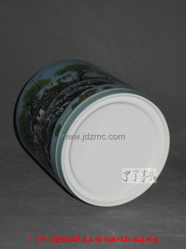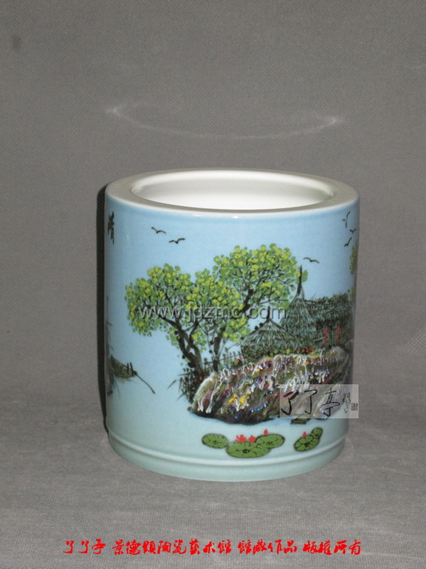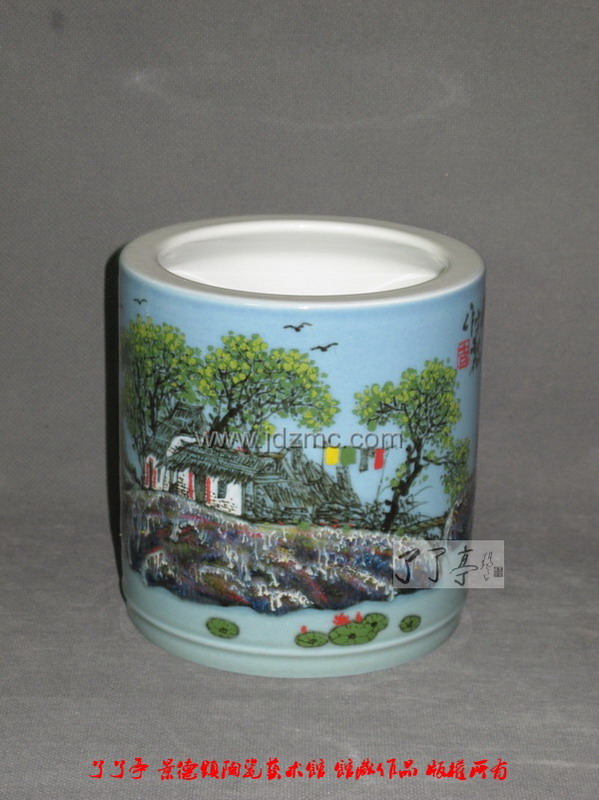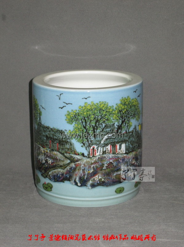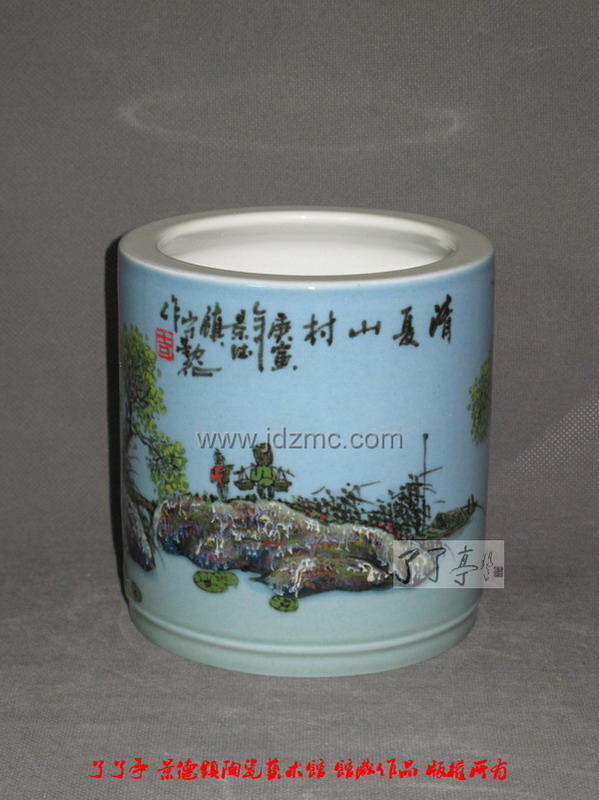 宁勤征 高温颜色釉“清夏山村”笔筒 高15厘米