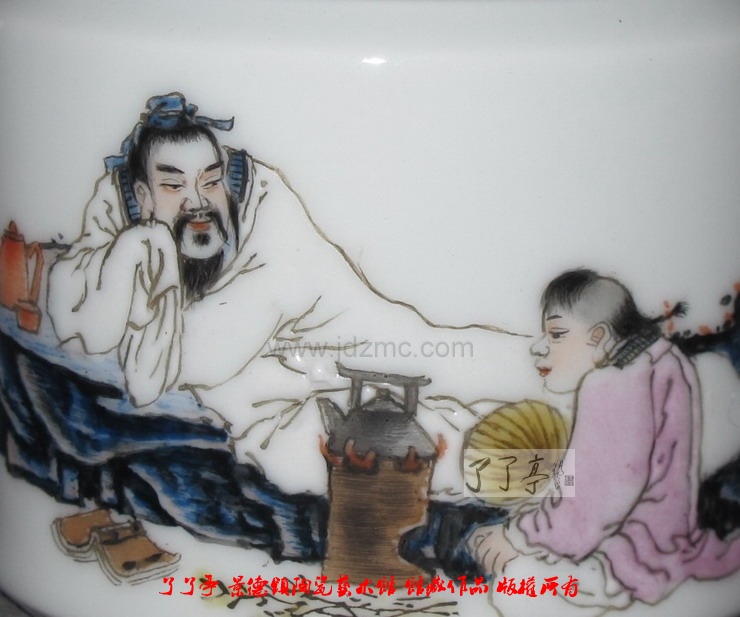 讲一个真实的小故事:十三年前,1996年,母亲第一次到景德镇就有缘地迂到了他.当时母亲看见他桌子上一个口径不到6厘米的小碗,里边有不少姻灰,很不受担待地丢在那里,但这杯子看起来很顺眼,母亲拿起来认真一看,好漂亮!上面居然画二十四个小小的有鼻子有眼的美人.无论面相和装饰都清晰而且娇好,整个布局.发色无可挑剔。吴伟明看母亲那么喜欢,说:"您要是喜欢,给您,最优惠,300元."。母亲立马掏了300元把碗拿下来了.这300元当时对母亲可不是小数字.母亲到景德镇只有2300元.当时50元可在市场上买到很大而且还不错的瓶。但母亲毫不犹豫,欣喜于心,当天在旅社里把玩了一个晚上。回到武汉,常得意地拿出来给朋友们欣赏.常常引来一片唏嘘声。当时怕别人要买,有意标了个1500元的价格,朋友们知道母亲的意思,也没人一定要买.放了大半年。来了个到武钢搞设备备件的法国工程师,爱瓷爱到痴迷程度,自从他发现了那个母亲藏在角落里的小碗开始,他一有空就来缠着母亲要这个小碗.一个星期来几次,先要还价,后来不谈价了,只求母亲放手给他。但母亲一直割舍不下没有答应。那年冬天很冷,有一天大雪漫天,整个市场没有几家开门,母亲因为与一朋友有约,九点到了市场,刚一坐下,一个高大的人影就跟进来了,一头一身的白雪,是他,法国工程师!他不说话,冻得红肿的手伸进大衣内胸袋掏出一张纸,递到母亲眼前:一张飞机票,他很紧张地说:我下午三点要起飞回法国,以后工作换了,没机会再来了,这碗能不能给我?没等母亲回过神来,他已把柜子里的碗拿到手里,一把钱也几乎同时放进柜子。母亲有点感动,不好意思拒绝。很心痛地看着他怀里揣着母亲心爱小宝贝飞快转身不见在一片大雪中了。当时的心情很复杂,反映不过来,但后来只要一想起来就很心疼,必竞,母亲也是个爱瓷爱到痴迷的收藏者!而且也流落得太远了,再想看也看不到了。