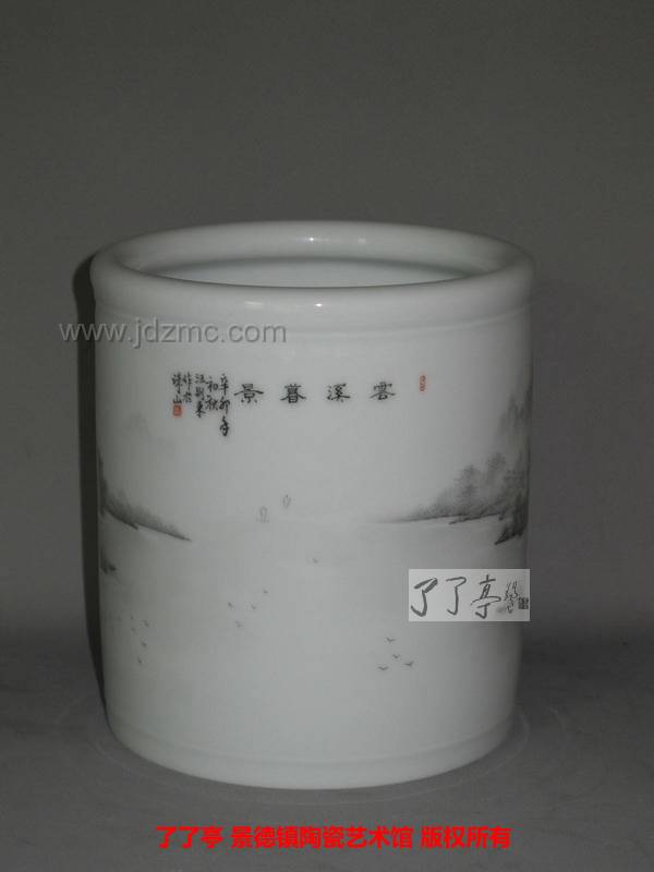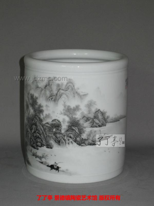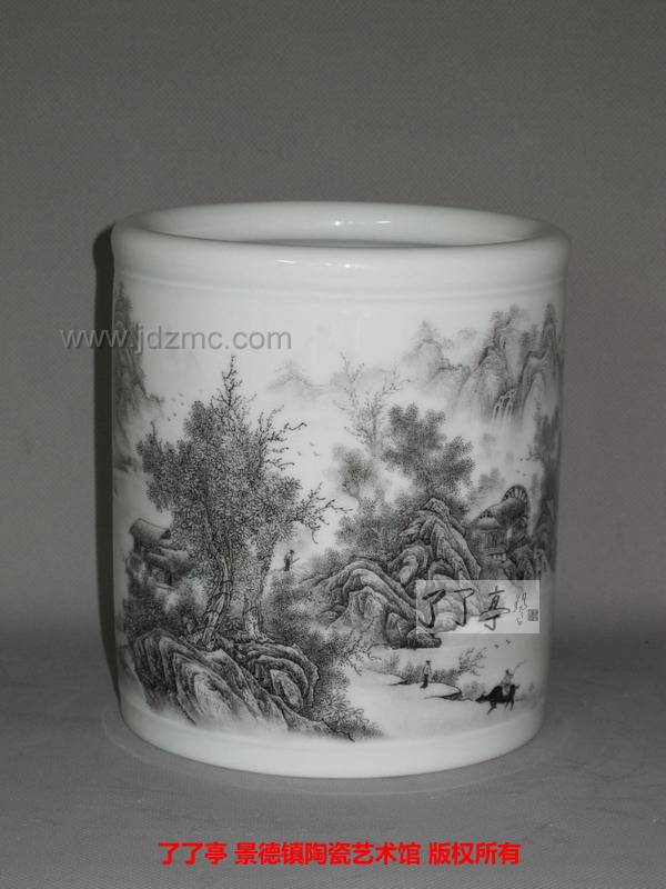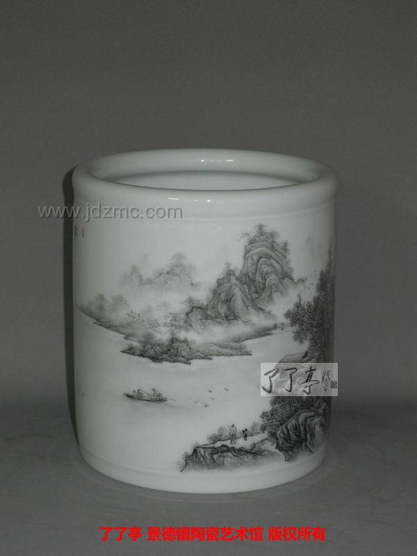 景德镇有的是“艺术家”,然而,像他这么好的功底,人数不多,尤其当今陶瓷艺木界,颇有点浮躁之气,一个年青人,每天睁大着眼晴一笔一划,一点一点,要耐得住寂寞啊!难能可贵。他们肩负着传承陶瓷精细山水画的历史责任。当然,他并没有走到最高峰,任重而道远,对于一个山水画家,要依靠自身功力,重新诠释陶瓷“山水”,应该成为一种至关重要的事业追求,溶入白己的艺术生命中,并体现在陶瓷艺术创作之中。