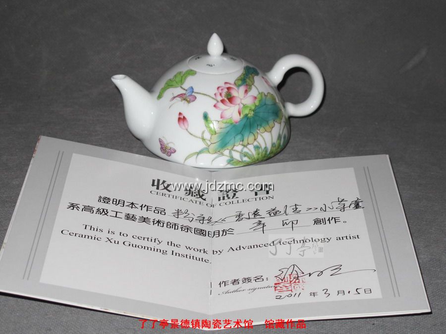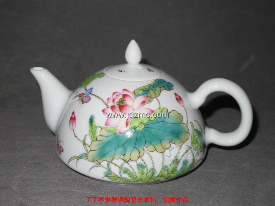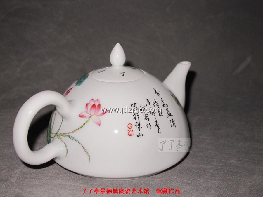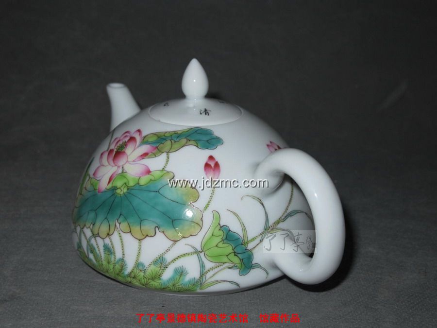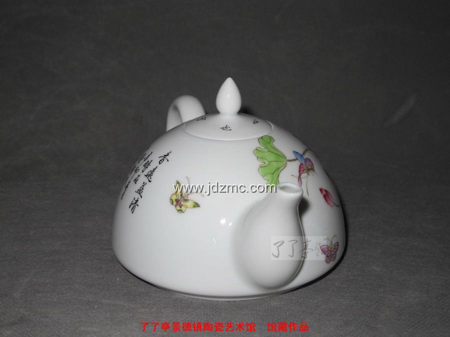 这些茶壶,拿到手的第一反应就是胎质非常好,莹润而且壶型不错。因而,徐国明老师在茶壶上是花费了不少功夫。茶壶的选择,体积颇大,所以在底部和茶壶盖上均有所图案装饰,这一圈图案装饰不但没有对画面进行圈定,反而加强了花卉布局的观赏性和富贵性。就画面而言,徐国明老师的笔下,无论是竹子还是牡丹,绘制的都是那样自由自在,放松闲散,疏落自然。加上图中动态呼应的工笔蝴蝶,小鸟等,好似世外桃源,又象是心灵的散步,毫无牵强与刻意。不知道您注意过没有,那一只过墙到茶壶另外一面的枝叶,将徐国明老师缜密的创作风格得以淋漓尽致的体现。徐国明老师在动笔之前,已经在胸中将题材酝酿了多时,并且在长期的创作过程中,把各种先前的画面反复体裁、筹思构图,充分的考虑了茶壶的画面构造,加上对自然现象的观察,这数枝过墙的枝叶,在徐国明老师的各种茶壶花卉题材中均有体现。这正是,邻家花满园,时复过墙来。一片葱绿色,居然为我栽。精神宽松的创作环境是从心灵到画面的充分映现。 了了亭·李申盛/文