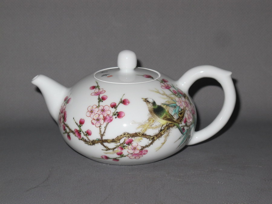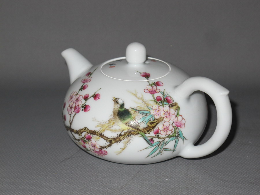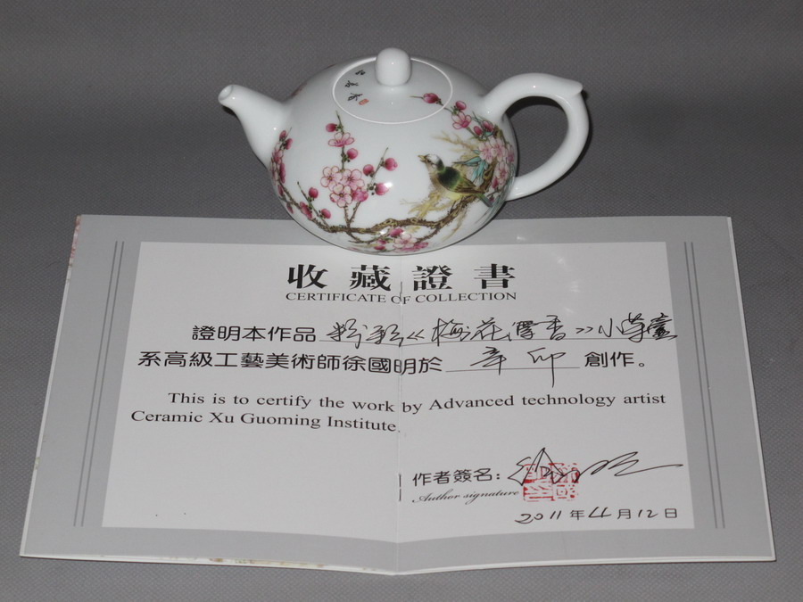 这些茶壶,拿到手的第一反应就是胎质非常好,莹润而且壶型不错。因而,徐国明老师在茶壶上是花费了不少功夫。茶壶的选择,体积颇大,所以在底部和茶壶盖上均有所图案装饰,这一圈图案装饰不但没有对画面进行圈定,反而加强了花卉布局的观赏性和富贵性。就画面而言,徐国明老师的笔下,无论是竹子还是牡丹,绘制的都是那样自由自在,放松闲散,疏落自然。加上图中动态呼应的工笔蝴蝶,小鸟等,好似世外桃源,又象是心灵的散步,毫无牵强与刻意。不知道您注意过没有,那一只过墙到茶壶另外一面的枝叶,将徐国明老师缜密的创作风格得以淋漓尽致的体现。徐国明老师在动笔之前,已经在胸中将题材酝酿了多时,并且在长期的创作过程中,把各种先前的画面反复体裁、筹思构图,充分的考虑了茶壶的画面构造,加上对自然现象的观察,这数枝过墙的枝叶,在徐国明老师的各种茶壶花卉题材中均有体现。这正是,邻家花满园,时复过墙来。一片葱绿色,居然为我栽。精神宽松的创作环境是从心灵到画面的充分映现。 了了亭·李申盛/文