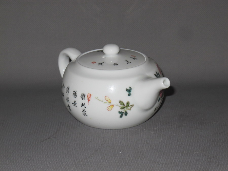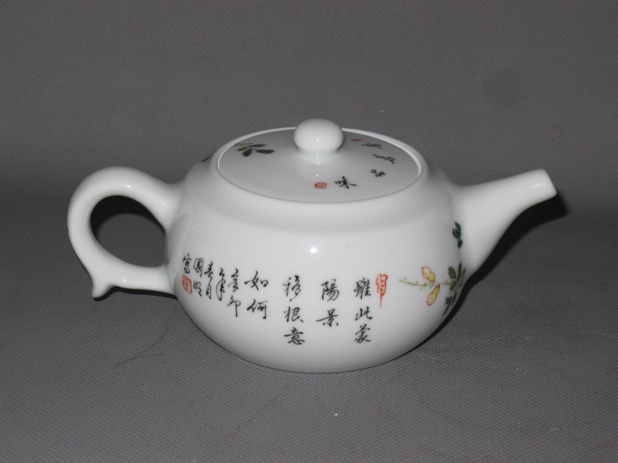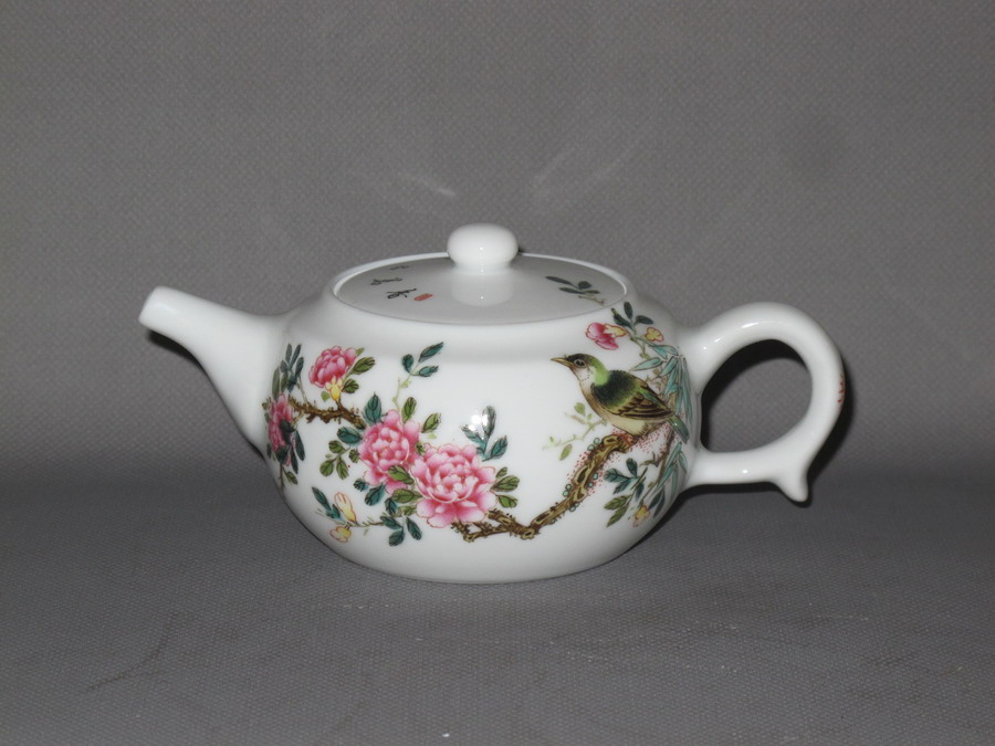 这些茶壶,拿到手的第一反应就是胎质非常好,莹润而且壶型不错。因而,徐国明老师在茶壶上是花费了不少功夫。茶壶的选择,体积颇大,所以在底部和茶壶盖上均有所图案装饰,这一圈图案装饰不但没有对画面进行圈定,反而加强了花卉布局的观赏性和富贵性。就画面而言,徐国明老师的笔下,无论是竹子还是牡丹,绘制的都是那样自由自在,放松闲散,疏落自然。加上图中动态呼应的工笔蝴蝶,小鸟等,好似世外桃源,又象是心灵的散步,毫无牵强与刻意。不知道您注意过没有,那一只过墙到茶壶另外一面的枝叶,将徐国明老师缜密的创作风格得以淋漓尽致的体现。徐国明老师在动笔之前,已经在胸中将题材酝酿了多时,并且在长期的创作过程中,把各种先前的画面反复体裁、筹思构图,充分的考虑了茶壶的画面构造,加上对自然现象的观察,这数枝过墙的枝叶,在徐国明老师的各种茶壶花卉题材中均有体现。这正是,邻家花满园,时复过墙来。一片葱绿色,居然为我栽。精神宽松的创作环境是从心灵到画面的充分映现。 了了亭·李申盛/文