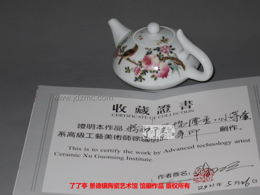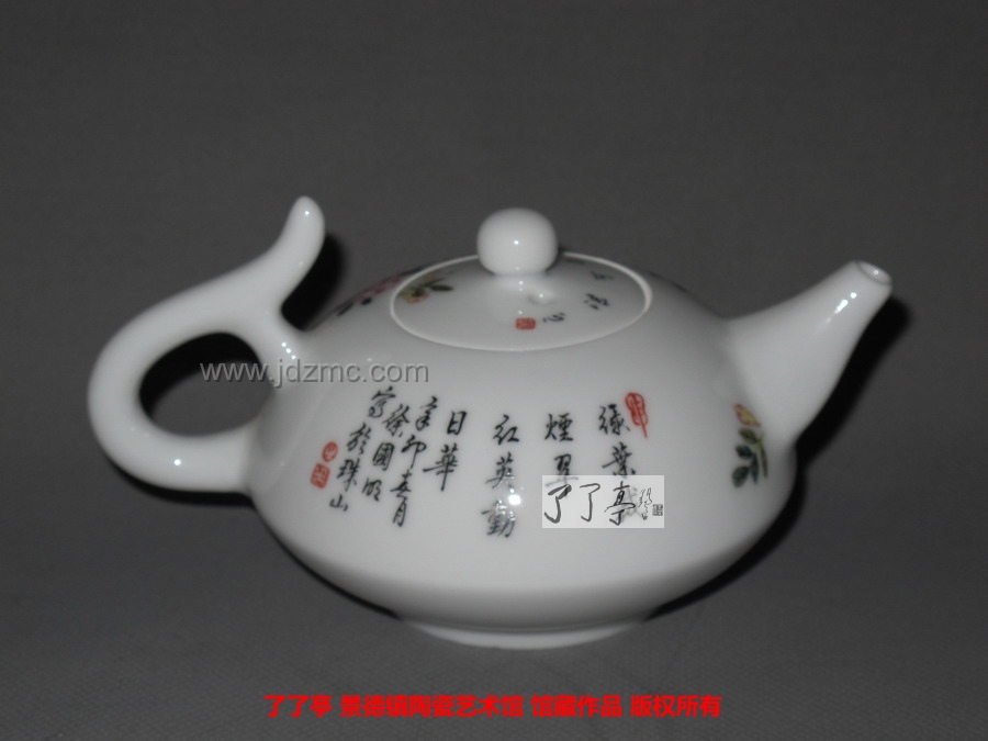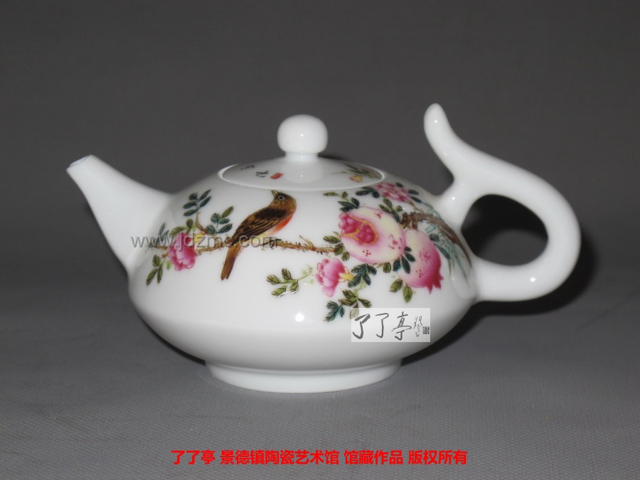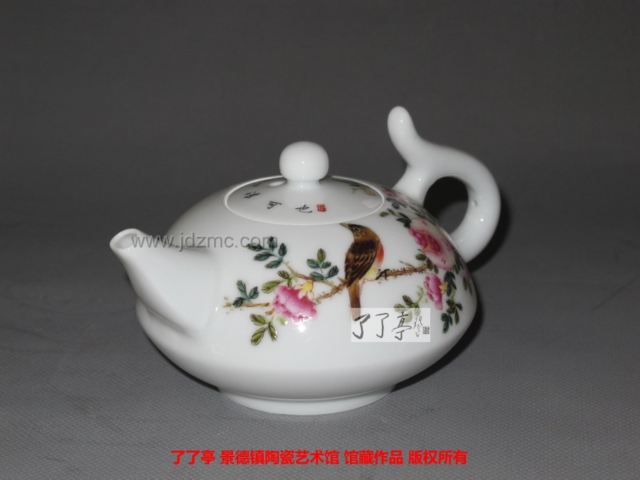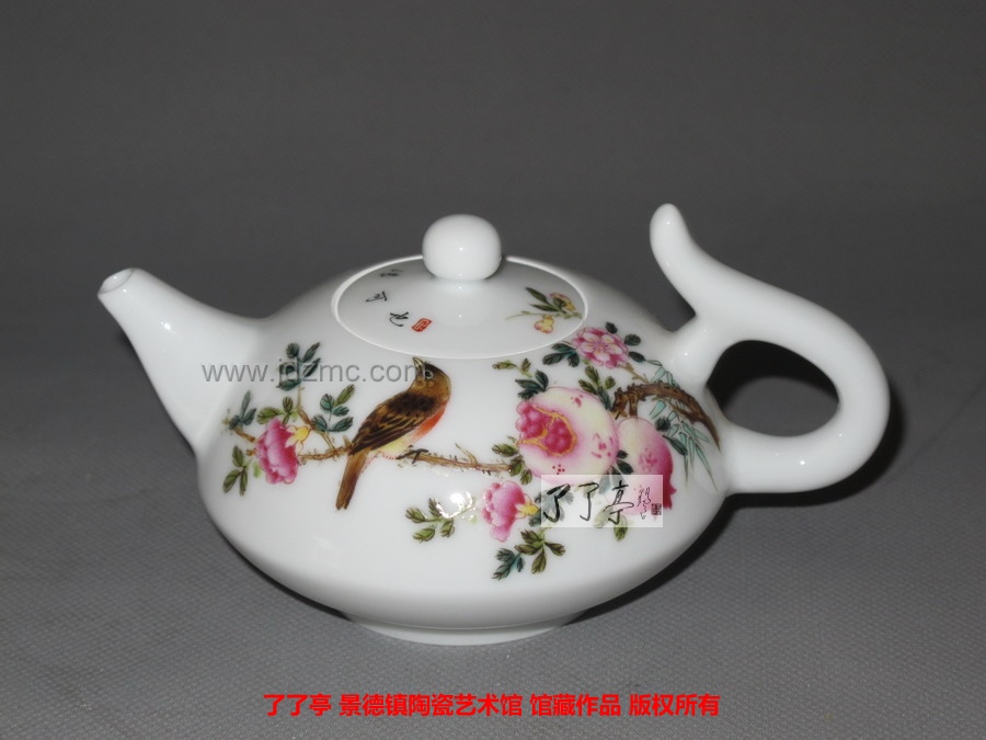 这些茶壶,拿到手的第一反应就是胎质非常好,莹润而且壶型不错。因而,徐国明老师在茶壶上是花费了不少功夫。茶壶的选择,体积颇大,所以在底部和茶壶盖上均有所图案装饰,这一圈图案装饰不但没有对画面进行圈定,反而加强了花卉布局的观赏性和富贵性。就画面而言,徐国明老师的笔下,无论是竹子还是牡丹,绘制的都是那样自由自在,放松闲散,疏落自然。加上图中动态呼应的工笔蝴蝶,小鸟等,好似世外桃源,又象是心灵的散步,毫无牵强与刻意。不知道您注意过没有,那一只过墙到茶壶另外一面的枝叶,将徐国明老师缜密的创作风格得以淋漓尽致的体现。徐国明老师在动笔之前,已经在胸中将题材酝酿了多时,并且在长期的创作过程中,把各种先前的画面反复体裁、筹思构图,充分的考虑了茶壶的画面构造,加上对自然现象的观察,这数枝过墙的枝叶,在徐国明老师的各种茶壶花卉题材中均有体现。这正是,邻家花满园,时复过墙来。一片葱绿色,居然为我栽。精神宽松的创作环境是从心灵到画面的充分映现。 了了亭·李申盛/文
