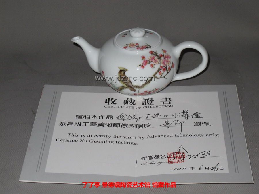 这些茶壶,拿到手的第一反应就是胎质非常好,莹润而且壶型不错。因而,徐国明老师在茶壶上是花费了不少功夫。茶壶的选择,体积颇大,所以在底部和茶壶盖上均有所图案装饰,这一圈图案装饰不但没有对画面进行圈定,反而加强了花卉布局的观赏性和富贵性。就画面而言,徐国明老师的笔下,无论是竹子还是牡丹,绘制的都是那样自由自在,放松闲散,疏落自然。加上图中动态呼应的工笔蝴蝶,小鸟等,好似世外桃源,又象是心灵的散步,毫无牵强与刻意。不知道您注意过没有,那一只过墙到茶壶另外一面的枝叶,将徐国明老师缜密的创作风格得以淋漓尽致的体现。徐国明老师在动笔之前,已经在胸中将题材酝酿了多时,并且在长期的创作过程中,把各种先前的画面反复体裁、筹思构图,充分的考虑了茶壶的画面构造,加上对自然现象的观察,这数枝过墙的枝叶,在徐国明老师的各种茶壶花卉题材中均有体现。这正是,邻家花满园,时复过墙来。一片葱绿色,居然为我栽。精神宽松的创作环境是从心灵到画面的充分映现。 了了亭·李申盛/文