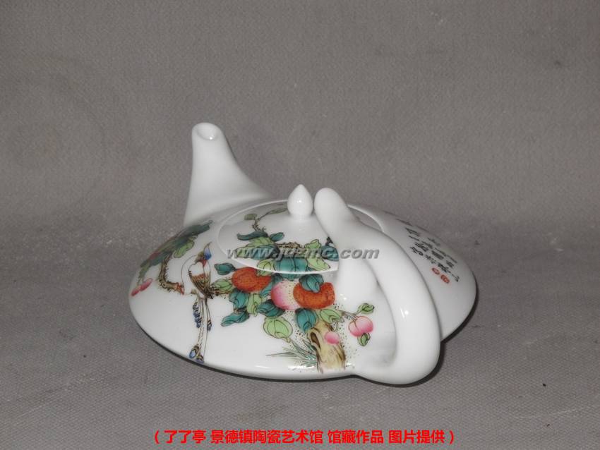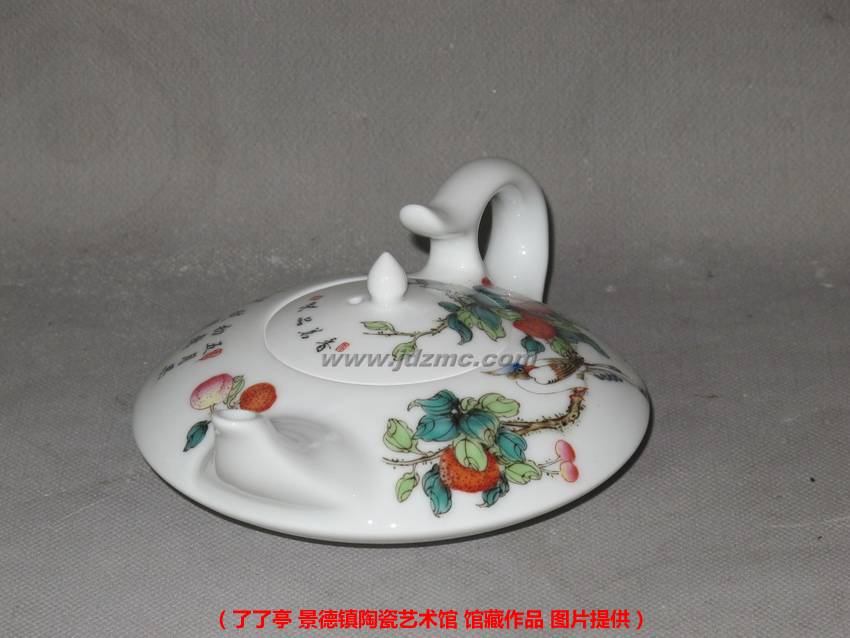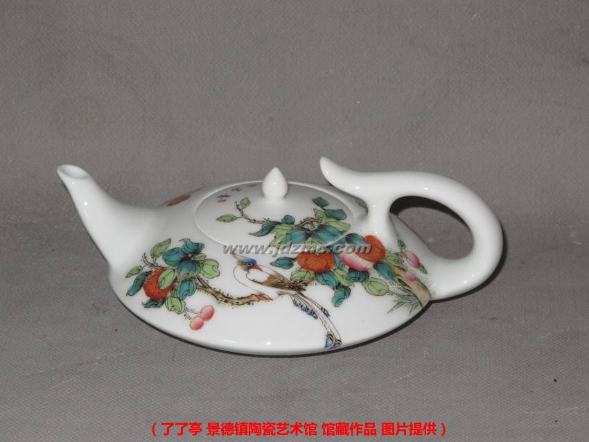 这些茶壶,拿到手的第一反应就是胎质非常好,莹润而且壶型不错。因而,徐国明老师在茶壶上是花费了不少功夫。茶壶的选择,体积颇大,所以在底部和茶壶盖上均有所图案装饰,这一圈图案装饰不但没有对画面进行圈定,反而加强了花卉布局的观赏性和富贵性。就画面而言,徐国明老师的笔下,无论是竹子还是牡丹,绘制的都是那样自由自在,放松闲散,疏落自然。加上图中动态呼应的工笔蝴蝶,小鸟等,好似世外桃源,又象是心灵的散步,毫无牵强与刻意。不知道您注意过没有,那一只过墙到茶壶另外一面的枝叶,将徐国明老师缜密的创作风格得以淋漓尽致的体现。徐国明老师在动笔之前,已经在胸中将题材酝酿了多时,并且在长期的创作过程中,把各种先前的画面反复体裁、筹思构图,充分的考虑了茶壶的画面构造,加上对自然现象的观察,这数枝过墙的枝叶,在徐国明老师的各种茶壶花卉题材中均有体现。这正是,邻家花满园,时复过墙来。一片葱绿色,居然为我栽。精神宽松的创作环境是从心灵到画面的充分映现。 了了亭·李申盛/文