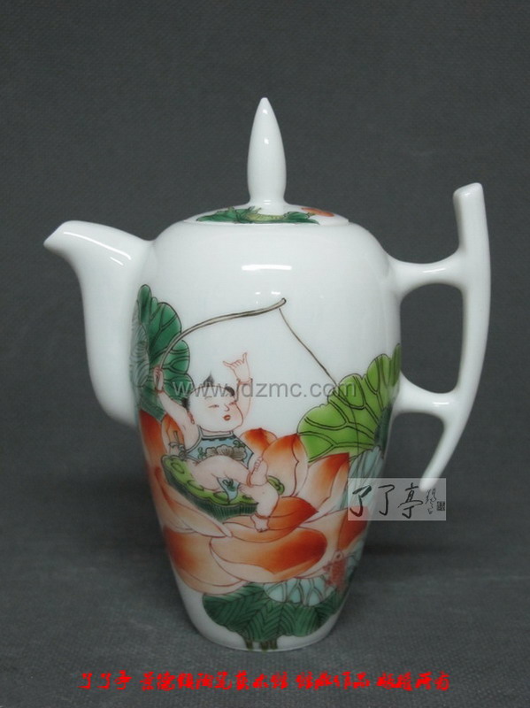 不久,一系列的蔡志忠(台湾漫画大师。先后创作中国经典古籍漫画《老子说》、《庄子说》等百余作品,已在三十多个国家和地区出版发行,对中国漫画及传统文化的国际化传播,做出了极大贡献。对70后80后的青年人的人生修养影响很大。)漫画系列古彩壶就画出来了。张万莲把个蔡志忠的人物谩画维妙维肖地坐落到一个个器型精美的手工壶坯上,李申盛为每个画面配上一句既有哲理,又苻画意,朗朗上口的生活名言.这个系列作品出来后,在景德镇日趋兴旺的茶具市场独具一格,很受收藏群体中的知识分子和热爱茶文化朋友及事业有成的朋友们喜爱,尤其是看蔡志忠漫画长大的一代中青年。至今已收到不少订单,只因为要手工制作的茶壶坯,又要全部手工绘制,画工要求颇严格.看过蔡志忠的漫画再审视古彩茶壶,您想想这是如何的要求啊!李申盛和张万莲的心态都比较好,定价适中,所以常常供不应求.