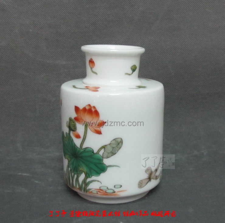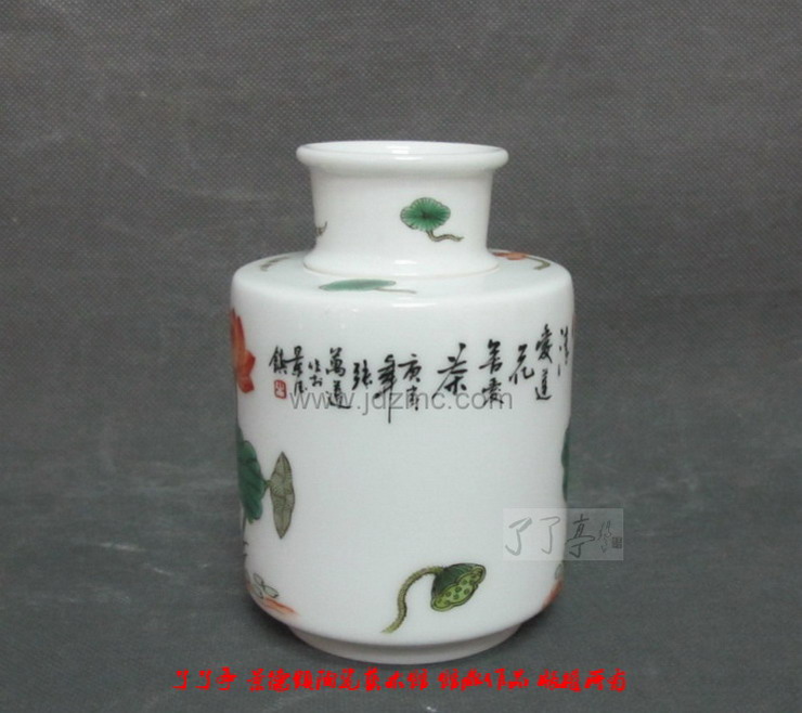 去年早些时候,我那负责网站的儿子李申盛到底寻觅着新闻和新事,迂见了张万莲。张万莲,高级工艺美术师,一九九七年毕业于景德镇市职工大学。中国美术家协会会员、中国画院江西分院院士、景德镇市青年美术家协会会员。从职工大学毕业后她步入仿古瓷的制作,主要是古彩和粉彩绘制。仿古要作精品,对从业人员要求是比较高的,仿古必须有很强的画作还原能力、要像、逼直,但又不能一味拘泥于原作,还要美,有强烈的感觉冲击力,打动关注者的心,才能立足市场。李申盛对张万莲的画作能力很感兴趣,于是就跟她交谈起来,很投缘,因为“了了亭”曾经想做一批古彩小件作为礼品,一直物色不到合适的画作者,一看一谈,就达成了一项合作:李申盛提出:由他提供资料,张万莲负责成画成瓷,创作一系列茶具新画面。这个建议得到张万莲热情的响应,一拍即合。
