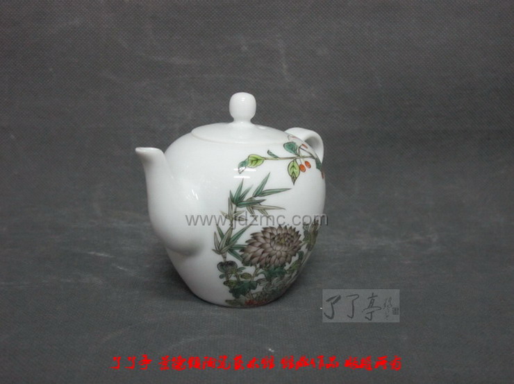 去年早些时候,我那负责网站的儿子李申盛到底寻觅着新闻和新事,迂见了张万莲。张万莲,高级工艺美术师,一九九七年毕业于景德镇市职工大学。中国美术家协会会员、中国画院江西分院院士、景德镇市青年美术家协会会员。从职工大学毕业后她步入仿古瓷的制作,主要是古彩和粉彩绘制。仿古要作精品,对从业人员要求是比较高的,仿古必须有很强的画作还原能力、要像、逼直,但又不能一味拘泥于原作,还要美,有强烈的感觉冲击力,打动关注者的心,才能立足市场。李申盛对张万莲的画作能力很感兴趣,于是就跟她交谈起来,很投缘,因为“了了亭”曾经想做一批古彩小件作为礼品,一直物色不到合适的画作者,一看一谈,就达成了一项合作:李申盛提出:由他提供资料,张万莲负责成画成瓷,创作一系列茶具新画面。这个建议得到张万莲热情的响应,一拍即合。