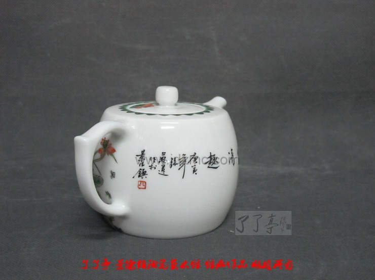 去年早些时候,我那负责网站的儿子李申盛到底寻觅着新闻和新事,迂见了张万莲。张万莲,高级工艺美术师,一九九七年毕业于景德镇市职工大学。中国美术家协会会员、中国画院江西分院院士、景德镇市青年美术家协会会员。从职工大学毕业后她步入仿古瓷的制作,主要是古彩和粉彩绘制。仿古要作精品,对从业人员要求是比较高的,仿古必须有很强的画作还原能力、要像、逼直,但又不能一味拘泥于原作,还要美,有强烈的感觉冲击力,打动关注者的心,才能立足市场。李申盛对张万莲的画作能力很感兴趣,于是就跟她交谈起来,很投缘,因为“了了亭”曾经想做一批古彩小件作为礼品,一直物色不到合适的画作者,一看一谈,就达成了一项合作:李申盛提出:由他提供资料,张万莲负责成画成瓷,创作一系列茶具新画面。这个建议得到张万莲热情的响应,一拍即合。