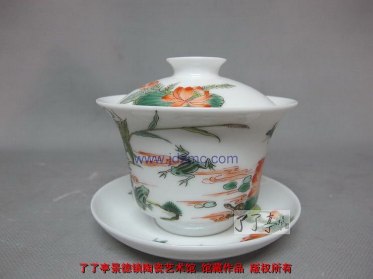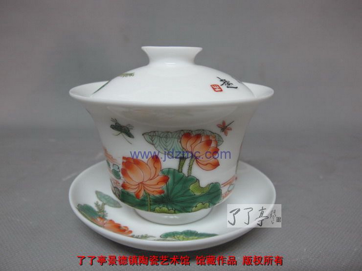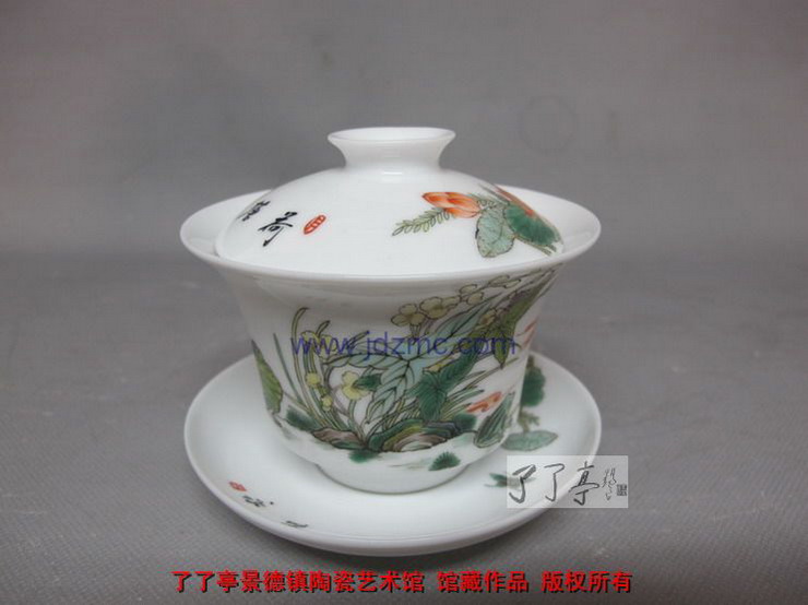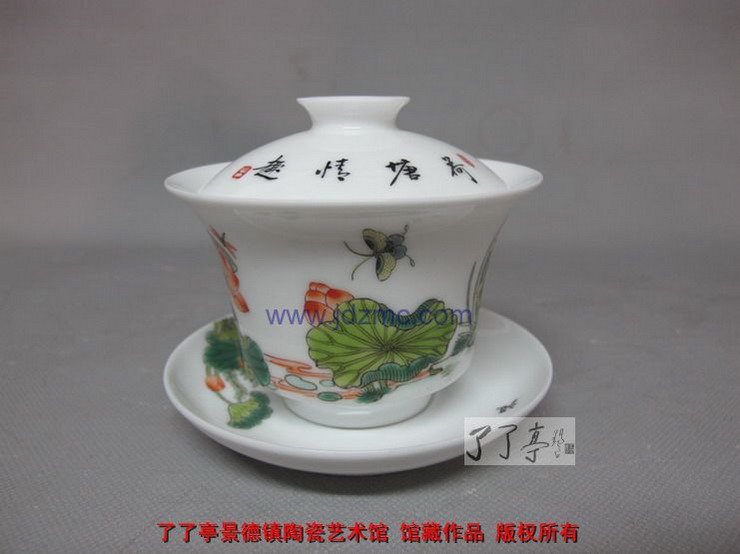 去年早些时候,我那负责网站的儿子李申盛到底寻觅着新闻和新事,迂见了张万莲。张万莲,高级工艺美术师,一九九七年毕业于景德镇市职工大学。中国美术家协会会员、中国画院江西分院院士、景德镇市青年美术家协会会员。从职工大学毕业后她步入仿古瓷的制作,主要是古彩和粉彩绘制。仿古要作精品,对从业人员要求是比较高的,仿古必须有很强的画作还原能力、要像、逼直,但又不能一味拘泥于原作,还要美,有强烈的感觉冲击力,打动关注者的心,才能立足市场。李申盛对张万莲的画作能力很感兴趣,于是就跟她交谈起来,很投缘,因为“了了亭”曾经想做一批古彩小件作为礼品,一直物色不到合适的画作者,一看一谈,就达成了一项合作:李申盛提出:由他提供资料,张万莲负责成画成瓷,创作一系列茶具新画面。这个建议得到张万莲热情的响应,一拍即合。