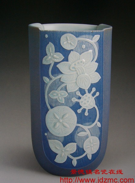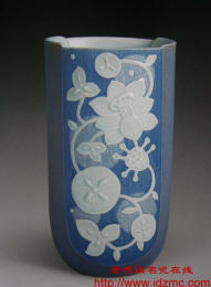 何教授的陶瓷艺术作品给人最为直观的印象是造型简约、大方,装饰典雅、清秀。作品多取材自然界中的小鸟、小花和小草,刻意表现自然界的谐和、温馨的情调和生命的活力;作品采用图案化的装饰形式,利用图案中夸张、变形与变异等手法,给人以严谨、隽永、精致之感;作品多用淡雅的低纯度色调,给人一种清新,雅致、柔和的色彩美感。
