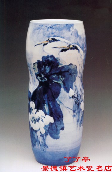 敛口,器体似葫芦形,造型浑厚丰满。作品采用青花写意笔法表现出荷塘生趣盎然的美景,画中鹭鸶凝视远望,若有所思;花和叶俯仰有致,相互穿插,景物的虚实处理体现了作者深厚的中国画艺术功底。