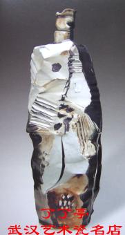 作品采用泥板围塑、泥条盘筑等综合手法,徒手制成。壶体呈束腰的筒状扭曲体,具有较强的体量感。细长的壶嘴与壶把构成了升腾感,形成了有效的虚拟空间,壶钮的处理构成了空间上的对应关系。多次烧成的棕色釉和形成的肌理效果,丰富了作品的艺术语言,从而使作品具有强烈的视觉冲击力。