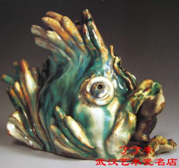 作品采用夸张、变形的手法,表现出鳜鱼张牙舞爪的神态。鱼翅的表现很有特点,以泥片处理成自然的意象造型,具有向外的扩张感,与主体形成强烈的对比,施酱色釉后,作品更富有装饰的韵味,丰富了作品的艺术语言。