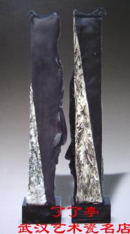 一对类似方柱体的造型,口部作扭捏变形处理。形体的轮廓外边平直挺劲,内边分别作曲线变化,并于器体下部各塑男女面部影像。优美曲线组合形式的富于虚实变化的空间,与挺直的轮廓线形成鲜明的对此。通体施黑色无光釉,作品整体感强,富有情趣。