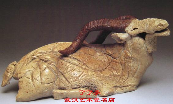 作品采用简洁的手法以泥片塑造出山羊的主体部分,局部的精彩刻画强化了对象的形态特征。夸张的犄角恰到好处地形成了空间关系上的照应,粗犷朴拙的塑造与精巧细腻的刻画形成了鲜明的对比。形态上的巧与拙,空间上的虚与实,色彩上的轻与重,使作品呈现出凝练自然的艺术格调。