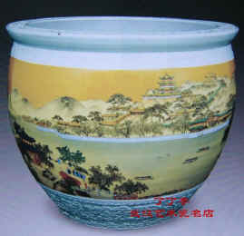 侈口,宽沿,鼓腹。造型雄浑有气派。作品以高温色釉、坯体雕刻和釉上情湛的瓷画工艺相结合,以金黄色调为地,用极富民族特色的墨彩描绘了气势恢宏·天人合一的清代颐和园胜景。通景式布局构图,以自然实景与富有情致的艺术表现相结合,把人物、殿阁、廊榭、亭桥、湖光山色等描绘得精细人微,诗意盎然。作品笔法柔中见刚,灵动飘逸,设色点染,典雅清秀,毫无雕琢之气,足见几位作者绘画艺术修养的全面和功力的深厚。