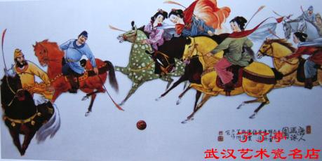 长方形,平面。画面以唐人马球竞技为题材,人物形态各异,富有节奏感,人物服饰和鞍马的刻画细致人微。此作色彩明快,气脉相连,情趣盎然,生动自然,给欣赏者以美的艺术享受。