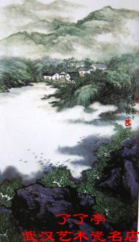 长方形,平面。作者以中国画技法与新彩陶瓷工艺相结合,以勾勒、皴擦、点染等技法描绘江南美景,前景山石和秀木丛林起伏,远处云山浑厚润泽,表现了雨后群山青翠欲滴、烟云缥缈、飞鸟翱翔的自然景色。