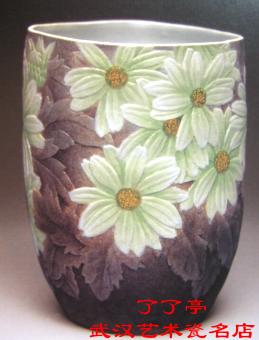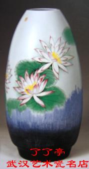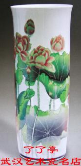 撇口,筒腹,连底足。造型挺拔大方。以新彩技法表现迎日荷花,构图依形造势,讲究节奏,精勾细染,注重新彩染色的晕润与层次。淡雅请新的色调,洋溢着素雅明快的艺术品格。