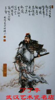 长方形,平面,釉白泛青灰。画面以《三国演义》中关云长单刀赴会故事为题材,表现了关羽威震四方的英雄气概。作品构图简洁,采用景德镇传统墨彩瓷绘技法描绘人物,表情丰富,神态感人,人物描写轻笔勾绘,衣褶和云气刻画细腻,整体配合甚为传神。