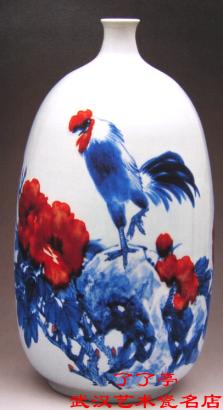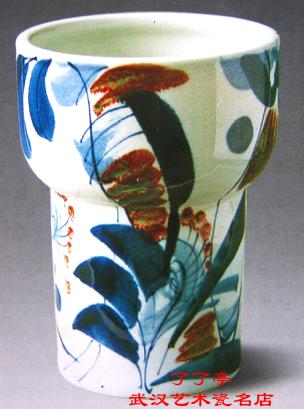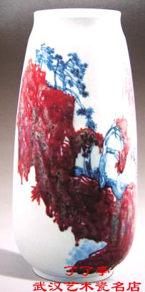 明清以来,海棠因其谐音而有富贵满堂的吉祥寓意。这件作品全用釉里红装饰,从整体上看,红白相间,点、线、面组成热烈的交响,细看肌理丰富,丽人寻味。作品另一个特点是具有环视效果,装饰与造型组合非常紧,枞每一个角度看都有欣蒉价值。这本是二方连续的特点,作品吸取了这一形式中的某些因素,加以变化,每个角度都可以说是主要面,随意一摆都好看。