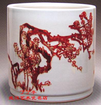 大口平削,唇口浑圆。直筒造型。足部旋削一道内弧线,使造型更富美感。瓷胎白细,釉色莹润微泛青。中国画式的构图以釉里红绘寒梅,笔法洗练,笔力遒劲;色相沉着的釉里红经高温窑变,茌梅干和梅花瓣上渗出绿色,带有春天的气息。