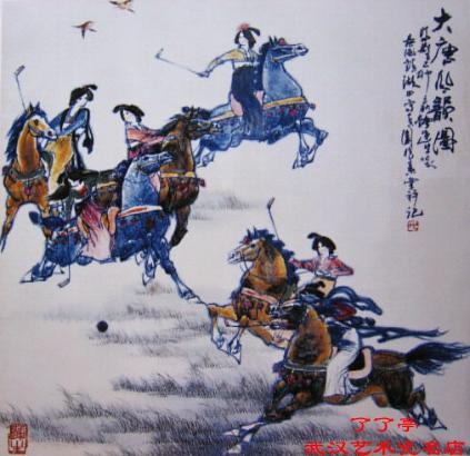 画家以青花、釉里红和色釉,用准确娴熟的技巧勾勒出大唐宫廷比赛马球的场景,人物造型生动,场面极其活泼华丽。贵妇们雍容的体杰,精致的头饰,华贵的服饰,表现得非常细腻。画面色彩雅致,构图疏朗,表现出一种高洁而热烈的情调,不愧为画家的精美之作。