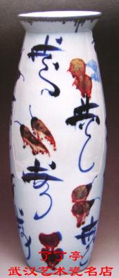 撇□,短颈,圈足,造型质朴敦厚。采用传统青花料、釉里红和最新试制的釉下水墨绿,用兼工带写手法作逋景松岭图来装饰器腹。一面以青花为主,另一面以釉里红为主。所绘青松岭、流泉飞鸟,构思奇巧新颖,色彩青、红穿插,意趣横生。下腹以青花色料及釉下水墨绿槠涂,浓淡得体,似水似云,给人以想象的空间。作品绘制精美,展现出背山劲松沐朝霞的意境与韵味。