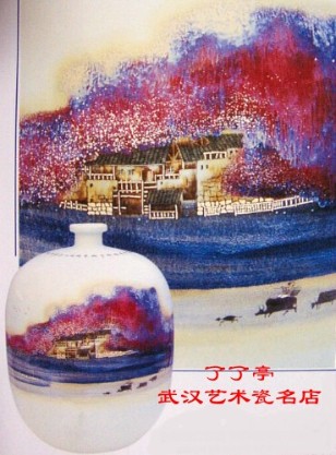 铜红釉渐变的色块,似秋枫满山,如桃霞漫园,造景于清浊之间,立象于虚实之中。而村舍藏掩露显,甚至窗槛墙石的勾描,生动具体;持笛横吹的牧童与蹒步而行的牛群,略形遗貌;整个画幅俨然是工写兼备的山水画,可谓“晚霞与霜枫辉映,心曲共天籁鸣和”。