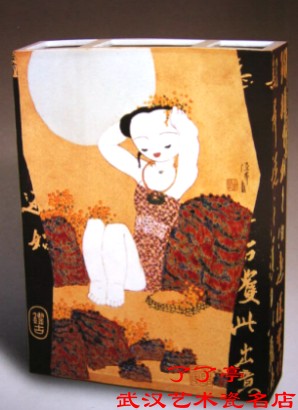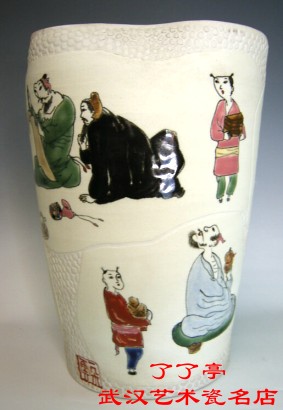 泥板镶接成型。造型以直线为主,器型规整,给人一种简洁、明快、挺拔之感。高温色釉装饰,作者巧妙地利用了含有较多铁质的坯胎色彩,将不同色相、不同透明度的釉料运用于一体。画面构图富有装饰性,人物造型生动,书法装饰新颖别致,颇有书卷气。
