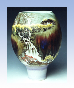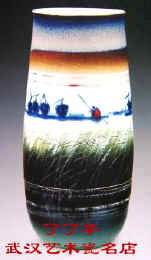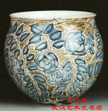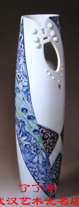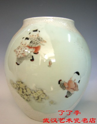 异型口,腹微鼓。口部别有新意,使单纯的造型别致秀雅。青花装饰与釉上彩绘相结合,画面布局匠心独具,与造型相得益彰,画法精细工整,色调请新明快,作品洋溢着蓬勃向上的清新活力。色彩鲜艳明亮,浓淡对比鲜明,层次清晰,立体感强。构图重心偏上,下部疏朗,双色相遇,有如窃窃私语,相互呼应。作品抒发了作者对美好生活的热爱和向往的情感。